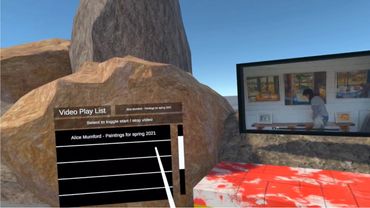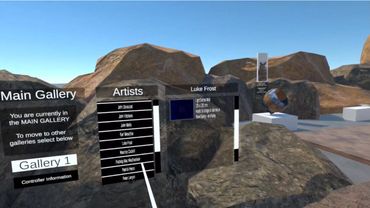 Example interactive VR art gallery where the visitor can select art works from the walls or stacks, view art information and watch art related videos.